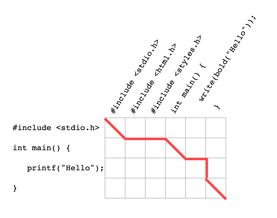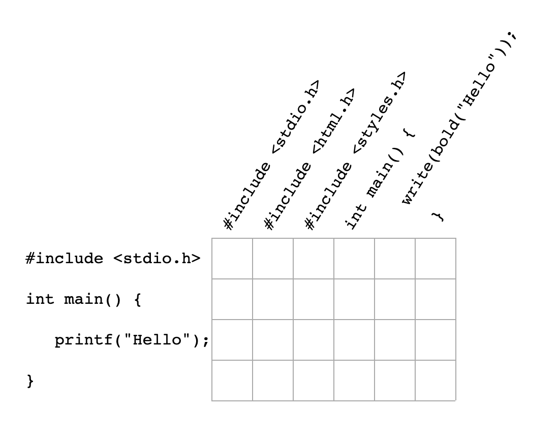 1 #include <stdio.h> 2 int main() { 3 printf("Hello"); 4 } 1 #include <stdio.h> 2 #include <html.h> 3 #include <styles.h> 4 int main() { 5 write(bold("Hello")); 6 } -